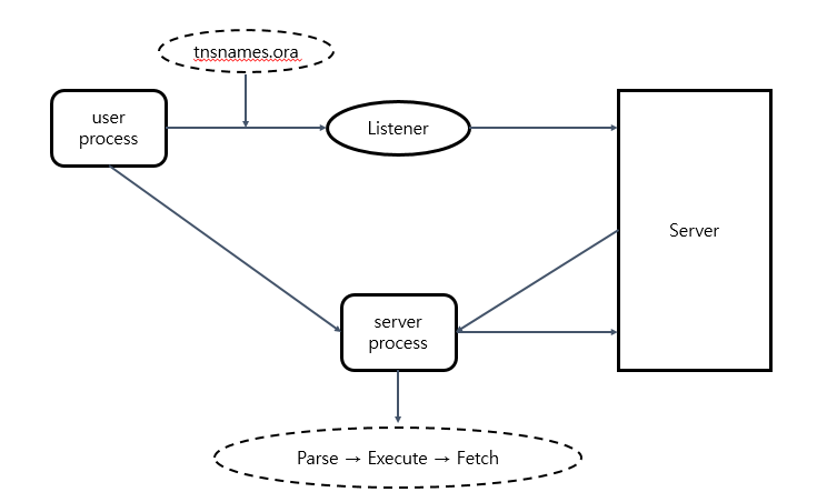 1. user process는 자신이 가져온 SQL문을 server process에 전달하기 위해 tnsnames.ora를 참고하여 서버를 찾아가