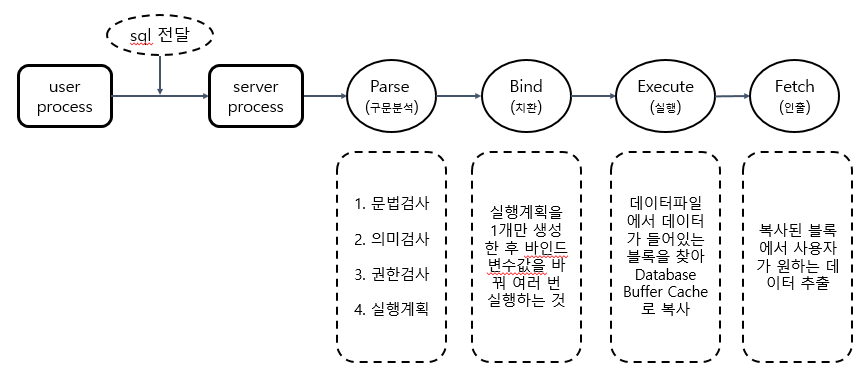 - 3. 공유되어 있는 실행계획이 있으면 execute 단계로 진행, 없으면(커서 공유를 실패하면) 옵티마이저를 찾아가 실행계획 생성 요청