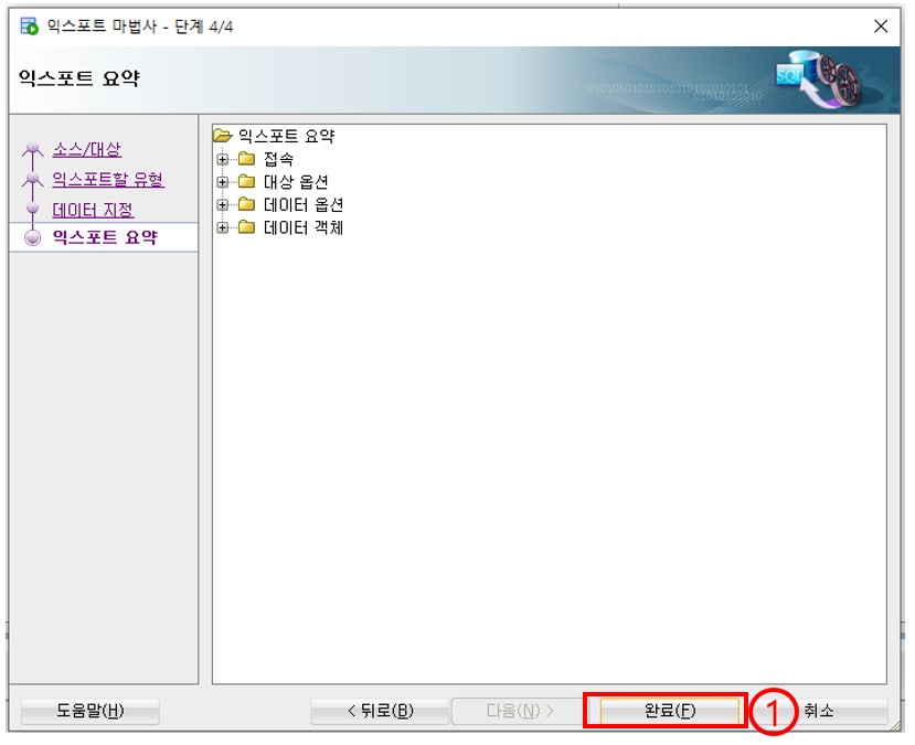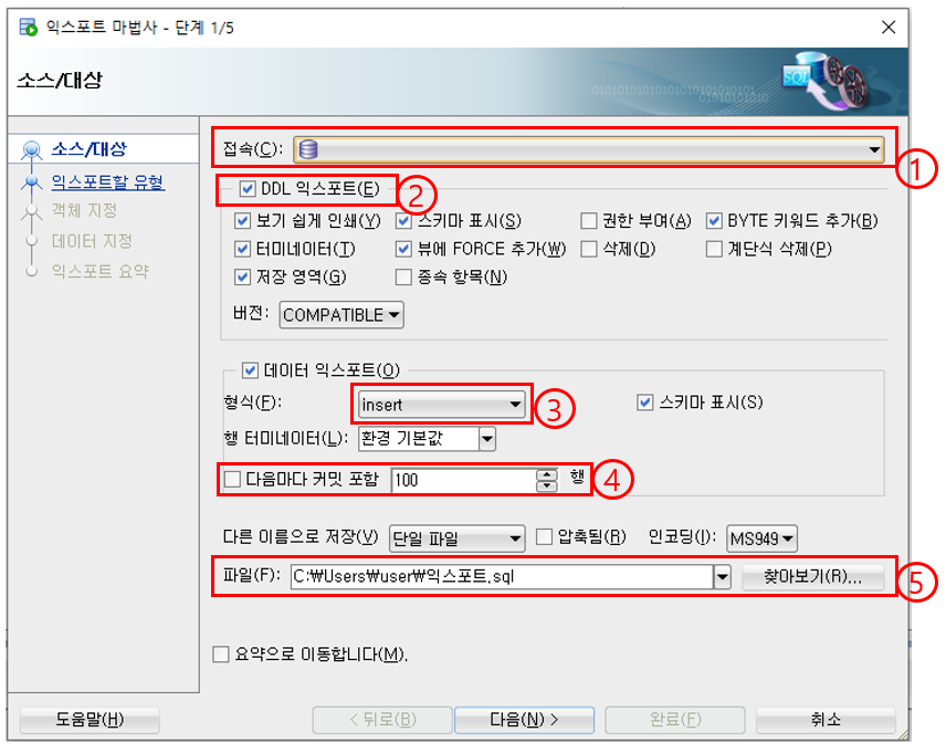 3) 데이터 익스포트(D) > 형식을 insert로 설정