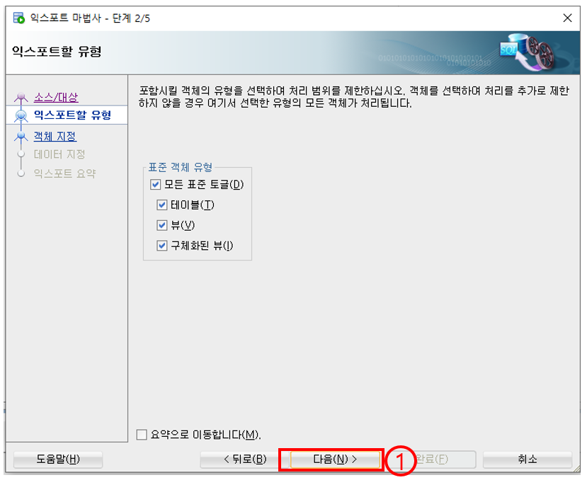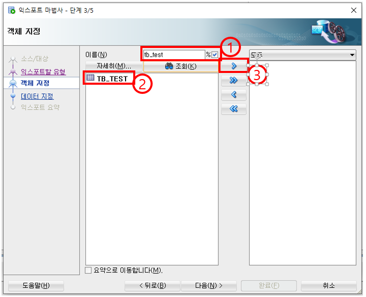 3) 객체 지정 (전체 이동 or 한개의 테이블만 이동)